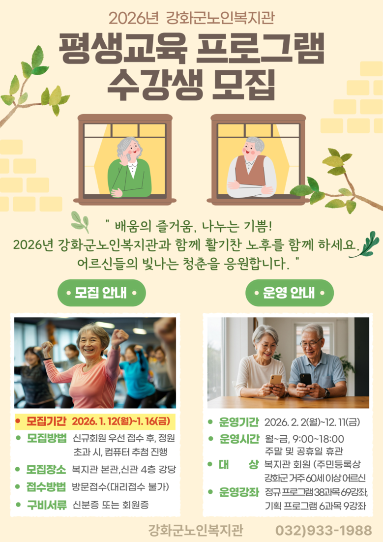 ‘강화군노인복지관 2026년 평생교육 프로그램’과 관련한 기타 자세한 사항은 강화군노인복지관(☎032-933-1988)으로 문의하면 된다.