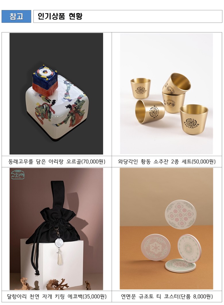 ◈ ▲꾸준한 신규 상품 출시 ▲무형유산 아트페어 및 「유네스코 세계유산위원회」와 연계 추진 ▲기관 대상 수요조사 실시 등 매출 증대를 위한 다양한 시도 병행
