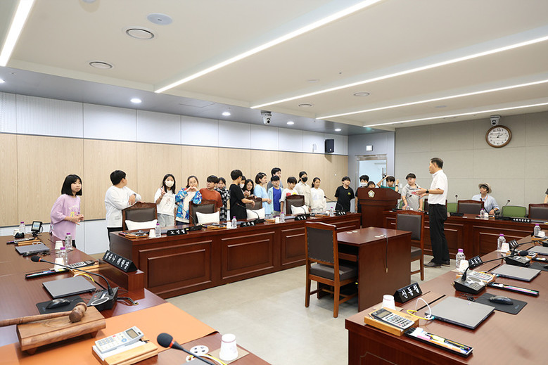이날 행사에는 영화초등학교 5학년 3개반 60여 명이 의회를 방문해, 지방의회의 역할과 기능을 배우고 민주적 의사결정의 의미를 이해하는 시간을 가졌다.