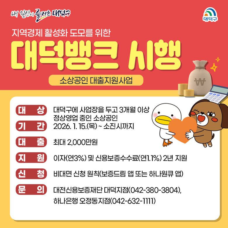 [대덕구 세계타임즈=이채봉 기자] 대전 대덕구는 경기침체로 자금 운용에 어려움을 겪는 지역 소상공인의 금융 부담을 완화하기 위해 소상공인 대출지원사업 ‘2026 대덕뱅크’를 시행한다.