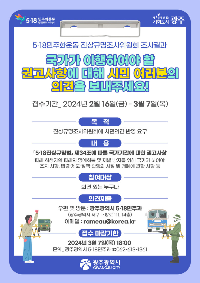시민 의견접수는 16일부터 3월 7일까지 진행되며, 국가에 대한 권고사항 관련 의견이 있는 시민은 시청을 방문하거나 등기우편(광주광역시 서구 내방로 111, 5·18민주과(치평동)), 이메일(rameau@korea.kr)로 제출하면 된다. 다만 재판 또는 수사 중인 사건, 5·18역사왜곡 및 폄훼, 허위·비방, 익명에 의한 제안 등은 제외된다.