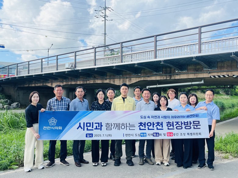 [천안시 세계타임즈=이현진 기자] 천안시의회(의장 김행금)는 지난 7월 1일(화), 도심하천특별위원회(위원장 이병하)주관으로 천안천 주요구간 현장 시찰과 부서 간담회를 실시하며, 도심하천의 체계적인 정비 방향에 대해 심도 있게 논의했다고 밝혔다.