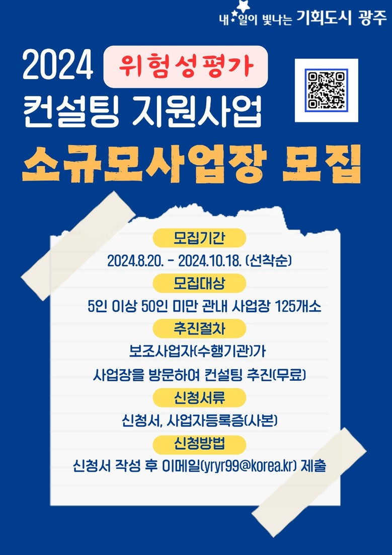 접수는 오는 10월 18일까지이며, 산업재해예방 컨설팅을 받고자 하는 사업자는 광주시 누리집(https://www.gwangju.go.kr/) ‘고시·공고’에서 위험성 평가 컨설팅 대상 사업장 모집 공고를 확인하면 된다.