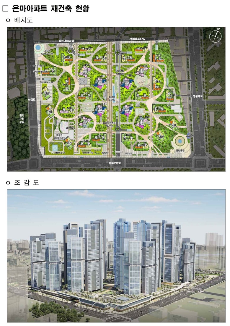 은마아파트는 2030년 착공, 2034년 준공이 목표다. 공영주차장을 설치해 대치동 학원가 상습 주차난을 해소하고, 개방형 공공도서관을 비롯해 국공립어린이집·치안센터·공원·저류시설 등 교육·복지·안전이 어우러진 주거 환경이 특징이다.