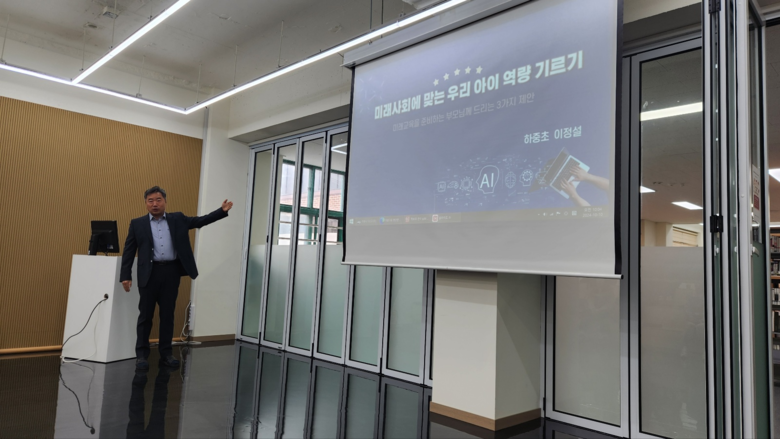 이번 연수는 평소 독서교육의 중요성을 알고 독서문화정착에 대해 학부모와 소통을 중요시한 이정설 하중초등학교장이 직접 강사로서 연수를 특별히 진행하였다. 불확실성의 시대인 미래사회에 대비하기 위해 “미래교육을 준비하는 초등학교 학부모님께 드리는 3가지 제안”이란 부제처럼 초등학교 학부모로서 미래사회 대비를 위해 어떤 점에 주의하여 양육해야 할지 지향점을 제시하여 우리 아이들이 행복한 생활을 영위하며 미래사회에 대비할 수 있는 능력을 키울 수 있도록 미래 교육에 대한 감수성을 키우는데에 목적이 있다.