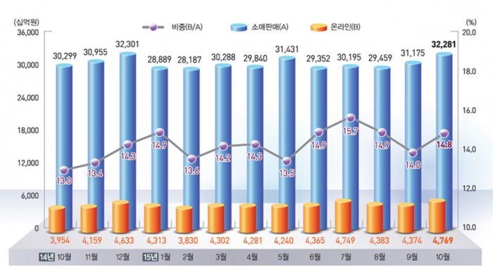 온라인쇼핑 거래액은 4조7690억원으로 전년 동월 대비 20.6% 늘었다. 10월 소매판매에서 온라인쇼핑 거래액 비중은 14.8%를 차지했다. 온라인쇼핑 거래액 중 모바일쇼핑 거래액 비중은 47.9%로 사상 최고수준을 기록했다.
