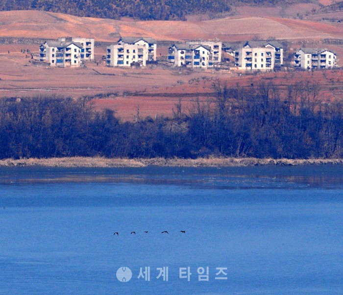 북한이 평안북도 방현 일대에서 동해상으로 탄도미사일을 발사했다고 합동참모본부가 밝힌 12일 경기도 파주 오두산 전망대 중립지역(공동관리구역) 앞으로 철새들이 날아가고 있다. 뒤로는 북한 황해북도 개풍군 관산반도 일대 모습. 2017.02.12.