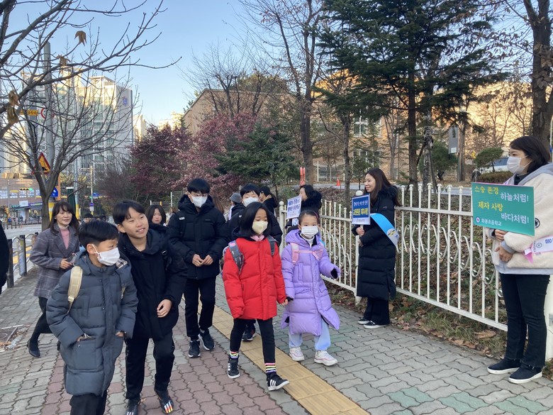 [남양주시 세계타임즈=송민수 기자] 경기도구리남양주교육지원청 화봉초등학교(교장 서동연) 학부모회 임원 등 10여 명은 21일 아침 8시 20분부터 40분 동안 교문 앞에서 ‘함께 가는 따스한 동행, 교권 존중, 제자 사랑’, ‘스승 존경 하늘처럼, 제자 사랑 바다처럼’등의 문구가 쓰인 피켓을 들고 선생님들의 교육활동을 응원하는 교권 회복 캠페인을 벌였다. 또한, 등교하는 학생들에게도 행복한 학교문화를 만들기 위해 동참을 권하는 의미에서 기념품을 제공하였다.