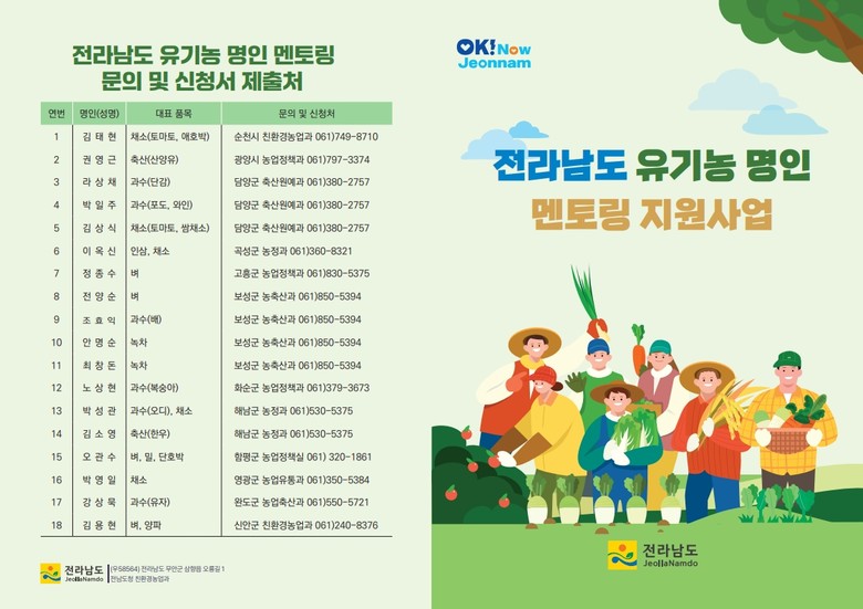멘토링 희망(멘티) 대상자는 전남에 거주 중인 친환경 농업인이나 친환경 농업을 희망하는 도민이다. 멘토링 비용은 전액 무료다.