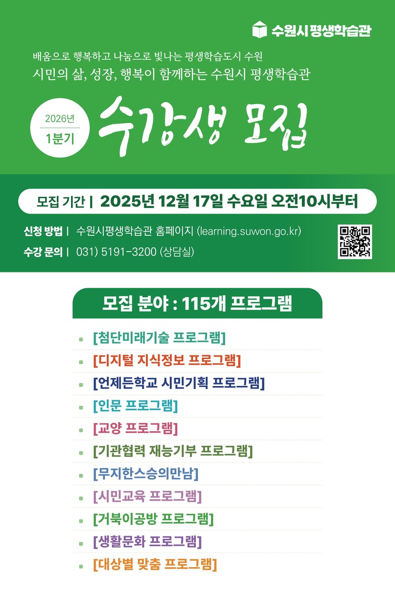 수원시는 새빛톡톡 시민 설문조사를 활용해 2026년 강사를 공개 모집했고, ▲생활문화 프로그램 ▲디지털 지식정보 프로그램 ▲대상별 맞춤프로그램 ▲첨단미래기술 프로그램 ▲교양 프로그램 등을 개설했다. 2026년에 분기별로 개설될 예정이다.