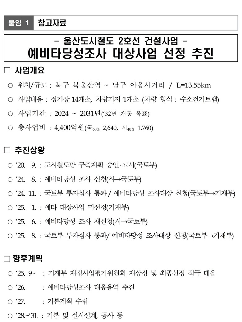 앞서 울산시는 지난해 8월 ‘도시철도 2호선 건설사업’의 예비타당성 조사 대상사업 선정을 위해 첫 도전에 나섰다. 하지만 올해 1월 기재부 재정사업평가위원회에서 사업의 시급성이 부족하다는 이유로 한차례 고배를 마신 바 있다.