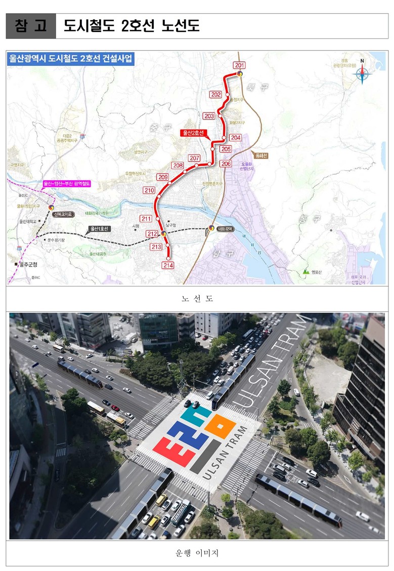 도시철도 2호선은 사업비 4,400억 원을 투입해 오는 2032년 개통을 목표로 추진하고 있는 사업이다. 운행 구간은 북울산역을 기점으로 북구 진장유통단지를 거쳐 중구 번영로를 통해 남구 야음사거리까지 13.55km로, 정거장 14곳을 설치한다.