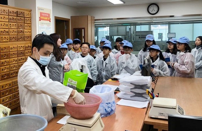 | ▲부산글로벌빌리지 주니어기자단 학생들이 자생한방병원 해운대 원외탕전원을 방문해 한약 조제과정을 견학하고 있다 . |