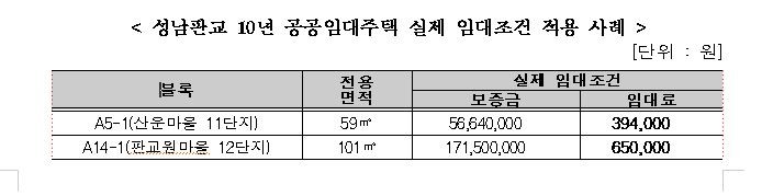 한편 판교지구에 적용한 실제 임대료는 전용 59m2는 월 394,000원, 전용 101m2는 월 650,000원으로 표준임대료보다 낮게 적용되어있다.