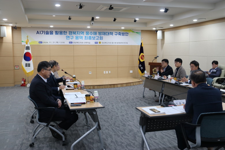 [경북 세계타임즈=한윤석 기자] 경상북도의회 풍수해 방재대책 연구회(대표 이동업 의원)는 21일(목) 도의회 다목적실에서 “AI기술을 활용한 경북지역 풍수해 방재대책 구축방안 연구”의 최종보고회를 성공적으로 개최했다.