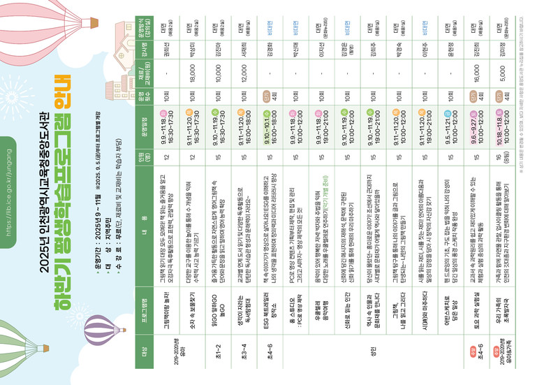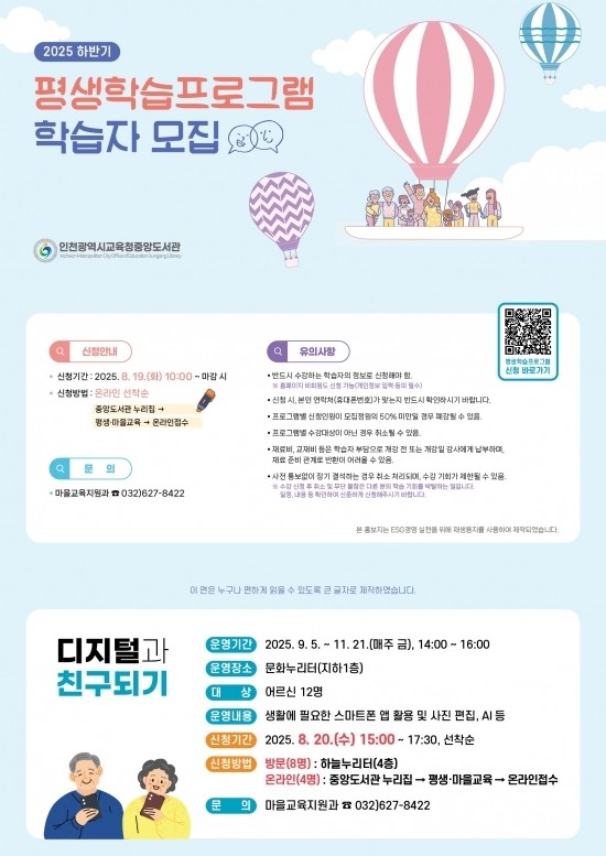 자세한 사항은 중앙도서관 누리집(https://lib.ice.go.kr/jungang/index.do) 또는 마을교육지원과(☎032-627-8422)로 문의하면 된다.