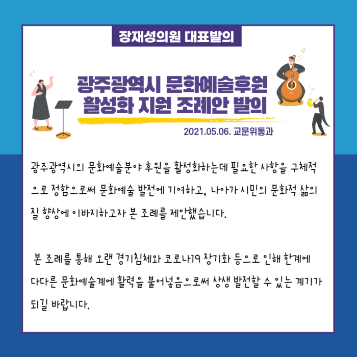 장재성 의원은 “광주광역시의 문화예술분야 후원을 활성화하는데 필요한 사항을 구체적으로 정함으로써 문화예술 발전에 기여하고, 나아가 시민의 문화적 삶의 질 향상에 이바지하고자 본 조례를 제안했다”고 제정 취지를 설명했다.