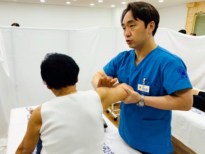 | ▲광주자생한방병원 염승철 병원장이 진료소에 방문한 환자를 치료하고 있다. |