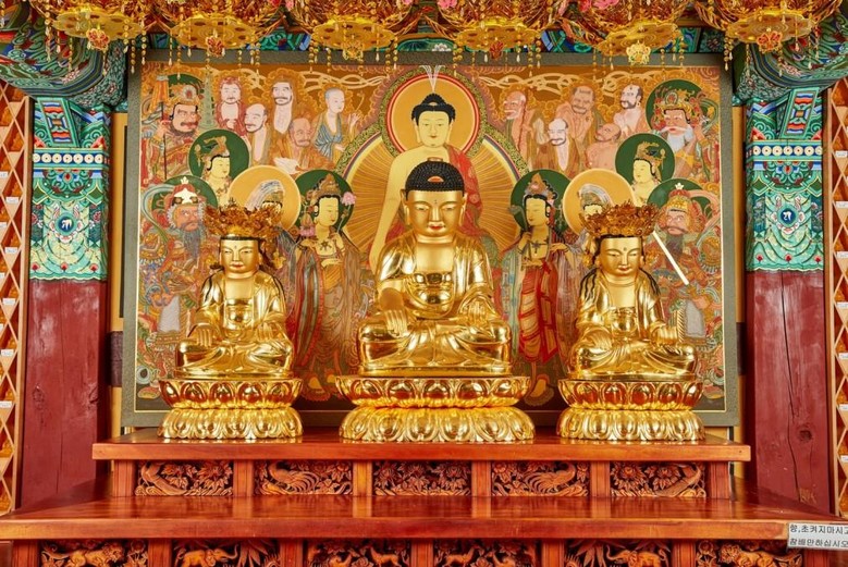 - 삼척 신흥사 대웅전에 주불로 봉안되어 있는 석조석가여래삼존좌상은 본존에 석가여래불, 좌우협시는 보살상으로 구성되어 있다.