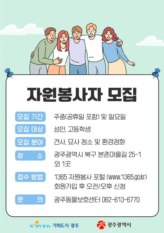 [광주 세계타임즈=손권일 기자] 광주광역시(시장 강기정)는 동물보호센터 자원봉사자를 수시 모집한다.