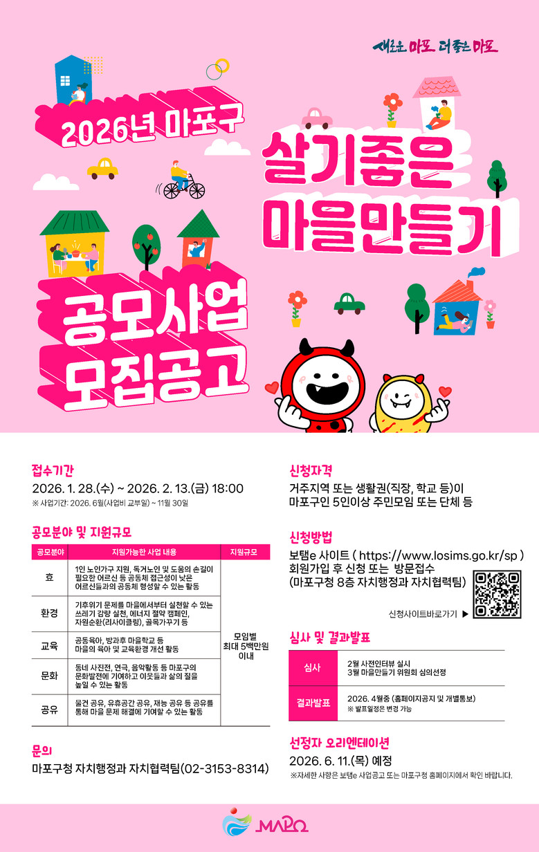 [마포구 세계타임즈=이장성 기자] 마포구(구청장 박강수)는 주민이 제안한 아이디어를 지원해 마을공동체 활성화를 도모하는 ‘2026년 마포구 살기좋은 마을만들기 공모사업’ 참여 대상자를 2월 13일까지 모집한다.