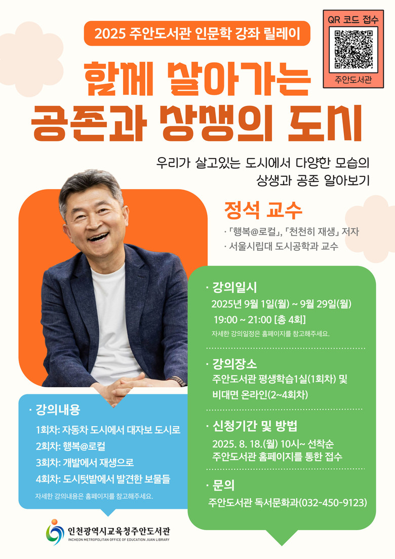 이번 강좌는 ‘도시에서의 공존’을 주제로 「행복@로컬」, 「천천히 재생」의 저자인 서울시립대학교 도시공학과 정석 교수를 초청해 도시 속 다양한 공존과 상생 사례를 소개한다.