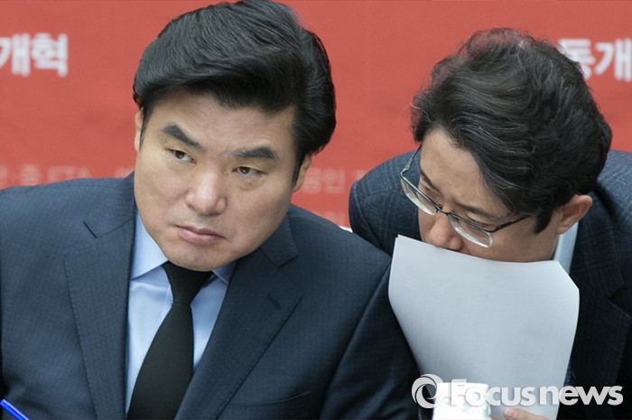 | △ 24일 오전 서울 여의도 국회에서 열린 새누리당 원내대책회의에 원유철(왼쪽) 원내대표가 참석해 한 당직자와 귀엣말을 하고 있다. <사진제공=포컷뉴스> |
