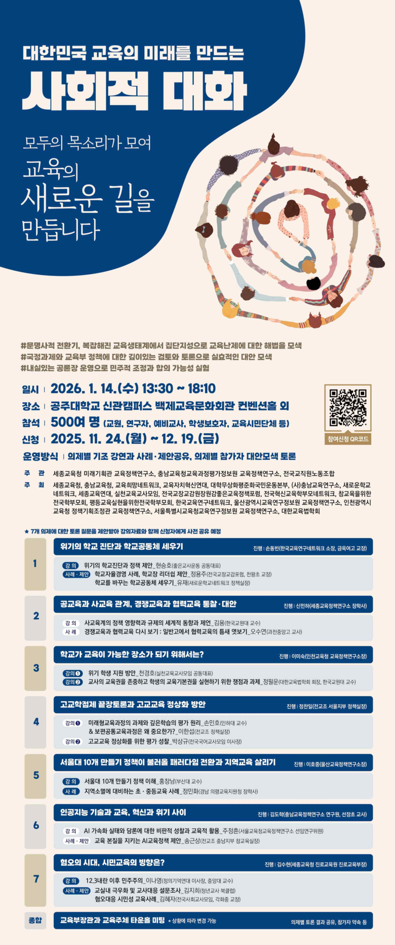 토론은 ‘모두의 목소리가 모여 교육의 새로운 길을 만든다’는 기조 아래 ▲위기의 학교 진단과 학교공동체 회복 ▲공교육과 사교육의 관계에 대한 통찰과 대안 ▲학교가 교육이 가능한 공간이 되기 위한 조건 ▲고교교육 정상화 및 고교학점제 ▲‘서울대 10개 만들기’와 지역교육 활성화 ▲인공지능 기술과 교육, 혁신과 위기 사이 ▲혐오의 시대, 시민교육의 방향 등 7개 핵심 의제를 중심으로 진행된다.