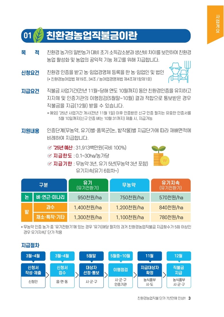 신청 대상은 2024년 11월부터 2025년 10월까지 친환경 인증을 유지하고 친환경농업을 충실히 이행한 농업(법)인이다. 인증기준 준수 여부와 인증 변동 사항 등에 대한 확인 절차를 거쳐 연말에 직불금이 지급된다.
