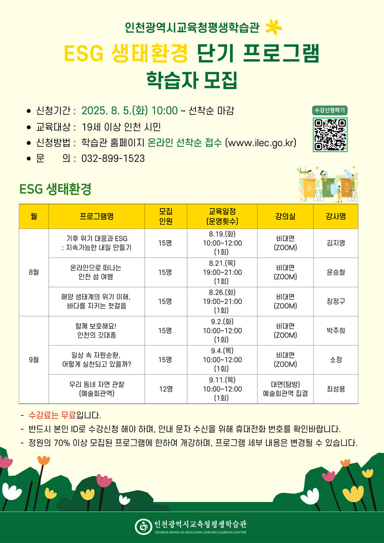 비대면 강좌는 ▲ 기후위기 대응과 ESG : 지속가능한 내일 만들기 ▲ 온라인으로 떠나는 인천 섬 여행 ▲해양 생태계의 위기 이해, 바다를 지키는 첫걸음 ▲함께 보호해요! 인천의 깃대종 ▲일상 속 자원순환, 어떻게 실천되고 있을까?」 등이며, 현장 탐방은 예술회관역 인근에서 진행되는 ‘우리 동네 자연 관찰’ 프로그램이 운영된다.
