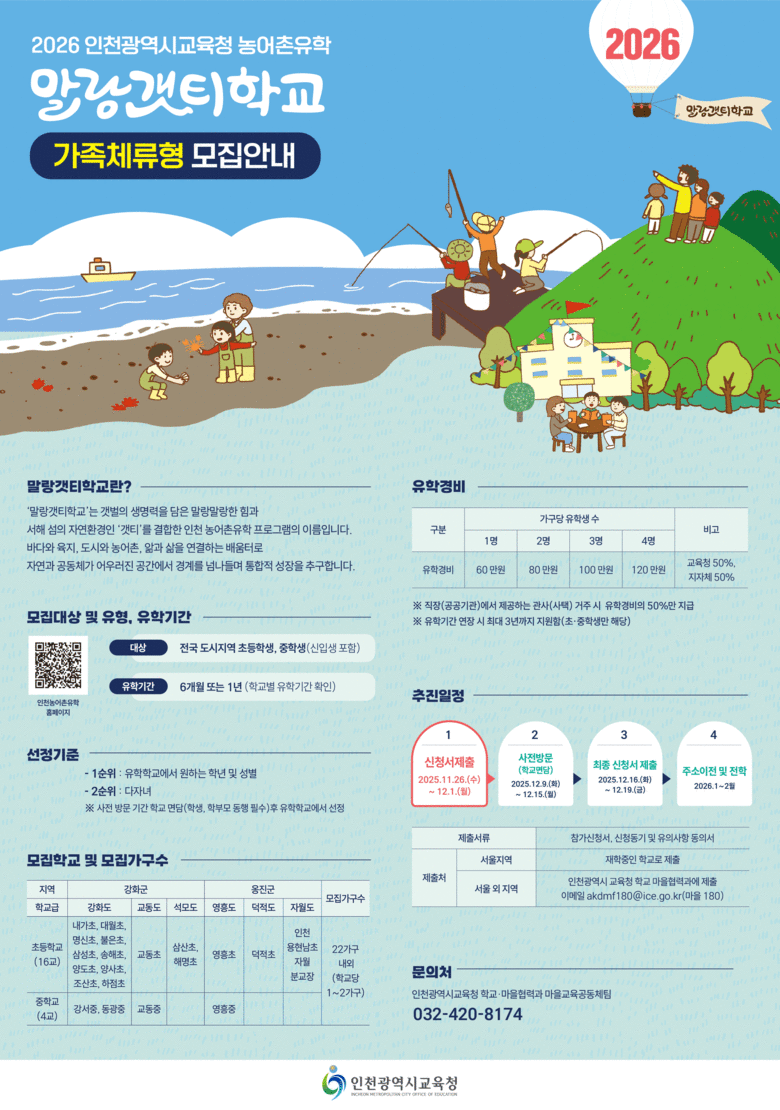 인천시교육청은 2026년부터 도시 학생들에게 농어촌 학교에서의 특별한 교육 경험을 제공하는 ‘말랑갯티학교’ 농어촌유학 프로그램 모집 대상을 전국으로 확대해 프로그램 활성화를 추진한다.