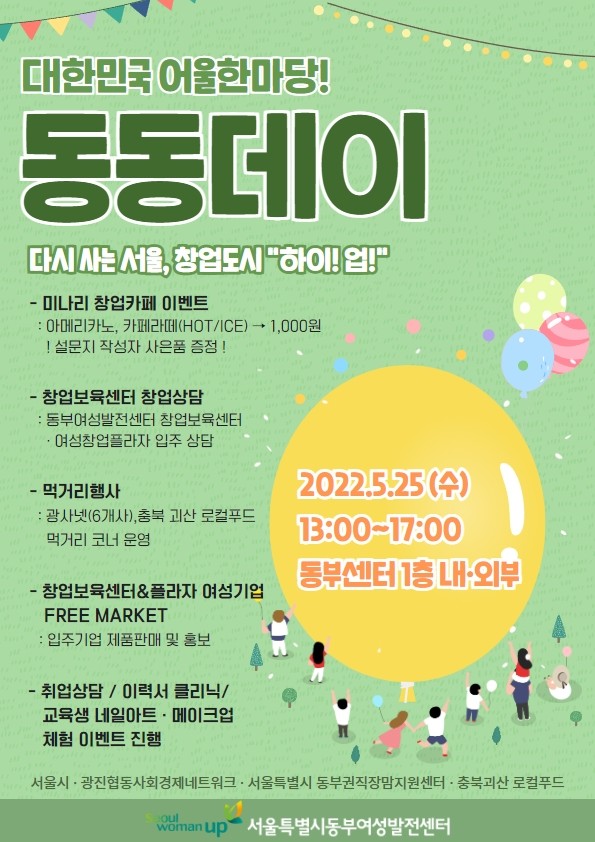 동부여성발전센터(광진구 자양동)는 5월 25일(수) 코로나로 2년 넘게 사업에 어려움을 겪고 있는 여성기업의 제품 판매·홍보를 위해 ‘동동(同動)데이’를 개최한다. 이번 행사는 동부창업보육센터 여성기업(15개)을 포함 총 20개 업체가 참여하며, 교육생과 시민들이 함께 한다.