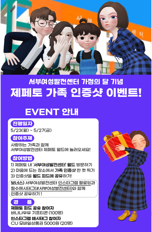 아울러 서부여성발전센터는 메타버스 플랫폼 ‘제페토(App)’ 내에 ‘서부여성발전센터 월드’를 지난 4월 26일 오픈했다. 이를 기념한 ‘메타버스 가족 인증샷 이벤트’도 함께 진행된다. 서부여성발전센터는 지난 1월 오픈한 온라인 스튜디오를 활용해서 6월 ‘라이브커머스 크리에이터 양성과정’을 진행하고, 디지털 소외계층 및 경력단절여성을 위한 AI 면접 대비 특강 등 교육과정도 개설할 예정이다. (문의 02-2607-8791)