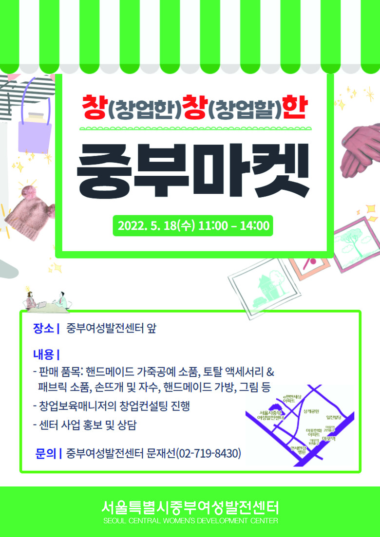 중부여성발전센터(마포구 용강동)는 5월 18일(수)에 여성창업자 지원을 위한 ‘창창(創創)한 중부 마켓’을 개최한다. 창업을 준비 중인 교육생들이 핸드메이드 가죽공예, 액세서리 및 패브릭 소품, 가방, 자수, 그림 등을 선보이고, 창업에 관심 있는 여성들을 위한 창업컨설팅도 함께 진행된다.