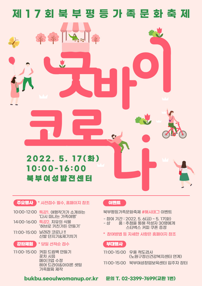 먼저 북부여성발전센터(노원구 중계동)는 5월 17일(화) ‘제17회 북부평등가족문화축제’를 개최한다. 3년 만에 개최하는 이번 축제는 2년 1개월 만의 사회적 거리두기 조치 해제에 따라 ‘굿바이 코로나’라는 주제로 코로나에 지쳤던 지역주민들을 위해 치유의 식물허브로 키친가든 만들기, 무료강좌 체험부스 등 다양한 프로그램을 운영한다.