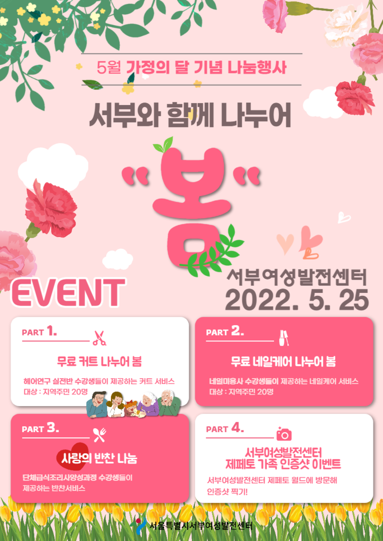 서부여성발전센터(양천구 신월동)는 5월 25일(수) ‘서부와 함께 나누어 ‘봄’을 개최한다. 이날 행사는 센터에서 직업교육을 수강하고 있는 교육생들의 재능기부로 진행된다. 세부 프로그램은 지역주민 및 취약계층을 대상으로 ▴헤어 연구 실전반의 무료 커트 ▴네일미용사 자격증 대비반의 무료 네일 케어 ▴단체급식조리사 양성과정의 사랑의 반찬 나눔을 진행한다.