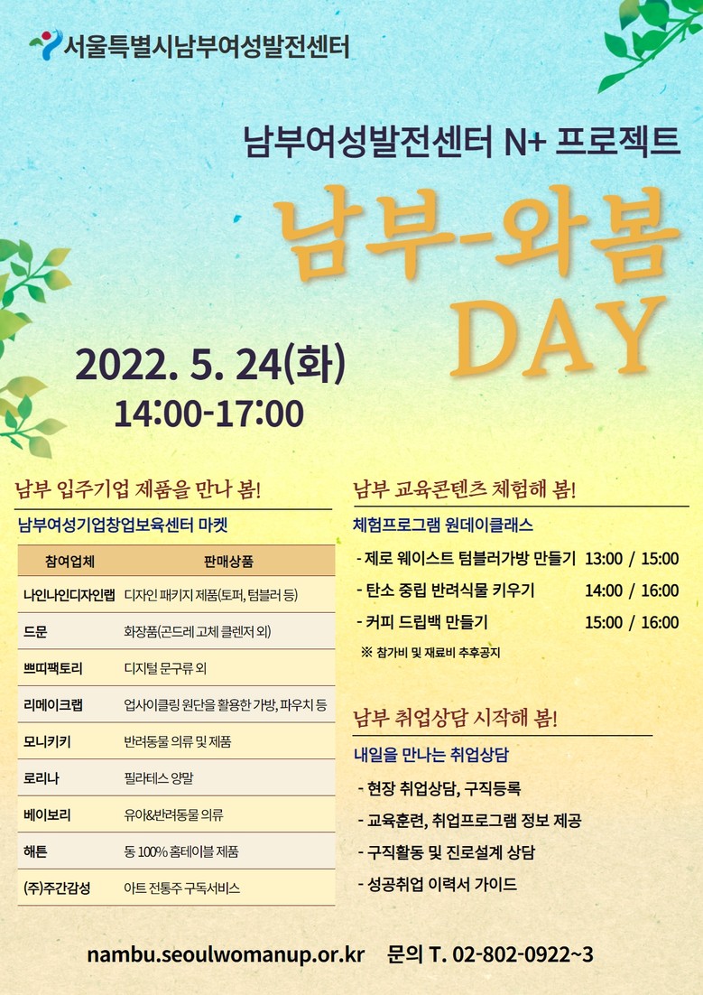 남부여성발전센터(금천구 시흥동)는 지역주민들과 교육생이 참여하는 ‘남부-와봄 Day’ 행사를 오는 5월 24일(화)에 개최한다.