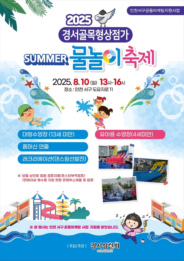 10일 일요일에는 경서골목형상점가(도요지로 11)에서도 물놀이 축제가 열린다. 오후 1시부터 4시까지 진행되며, 13세 미만 어린이를 위한 대형 수영장과 4세 미만 유아용 수영장이 설치될 예정이다.