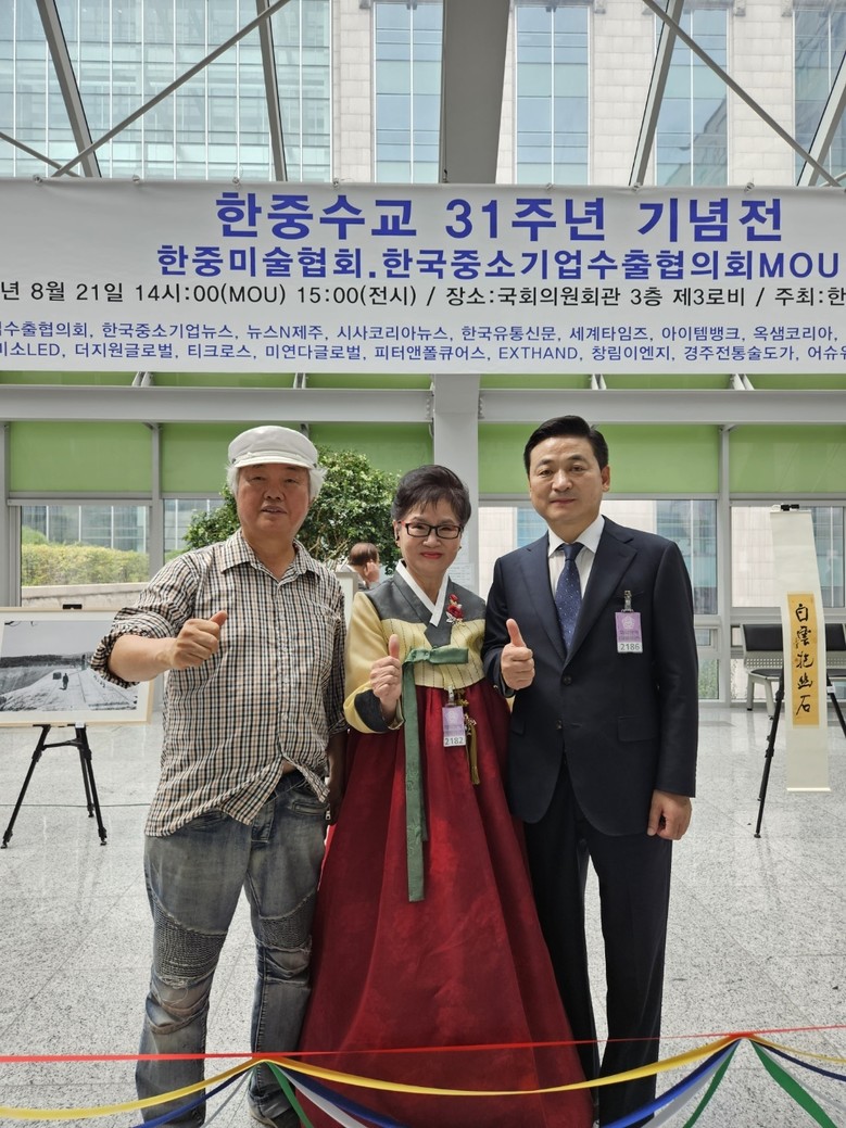 [세계타임즈]최성룡기자 = 지난 8월 21일 국회의원회관에서 윤주경 국회의원과 한중미술협회 주관으로 한중수교 31주년을 기념하기 위해 한국과 중국 작가들의 작품 전시회가 윤주경 국회의원과 조은희 국회의원, 한국미술협회 회원 작가들, 한국중소기업수출협의회 회원사 대표들이 참석한 가운데 개최했다.