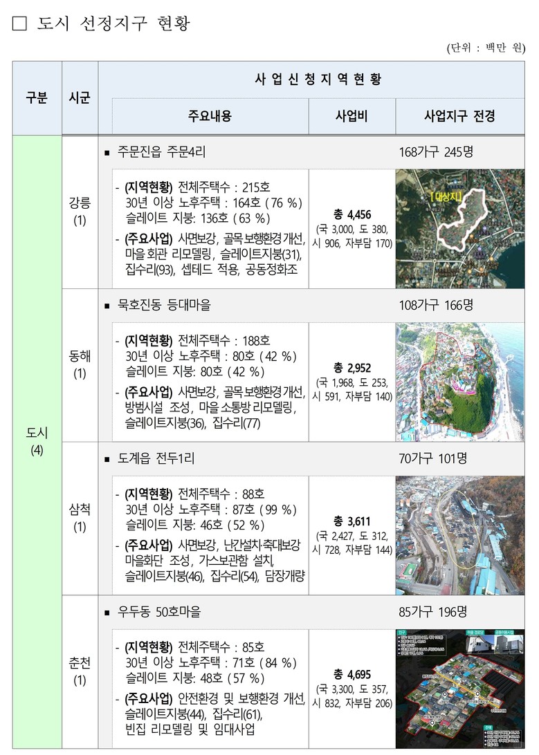 도는 이번 사업을 통해 향후 4~5년간 총 256억 원(국비 173억 원, 지방비 69억 원, 자부담 14억 원)을 투입하여, 취약지역의 안전 확보, 생활‧위생 인프라 확충, 주택 정비 지원, 일자리‧문화‧복지 등 휴먼케어, 주민 역량 강화 등 취약지역의 전반적인 정주 여건 개선을 종합적으로 추진할 계획이다.