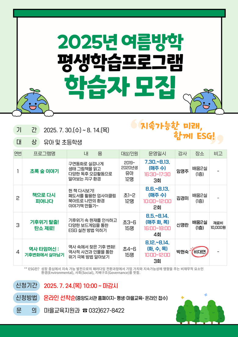 운영 프로그램은 총 4개로 ▲초록 숲 이야기(2019~2020년생 유아)는 ▲책으로 다시 피어나다(초1~2) ▲기후위기 탈출! 탄소 제로!(초3~6) ▲역사 타임머신 : 기후변화에서 살아남기(초4~6/비대면)로 구성했다.