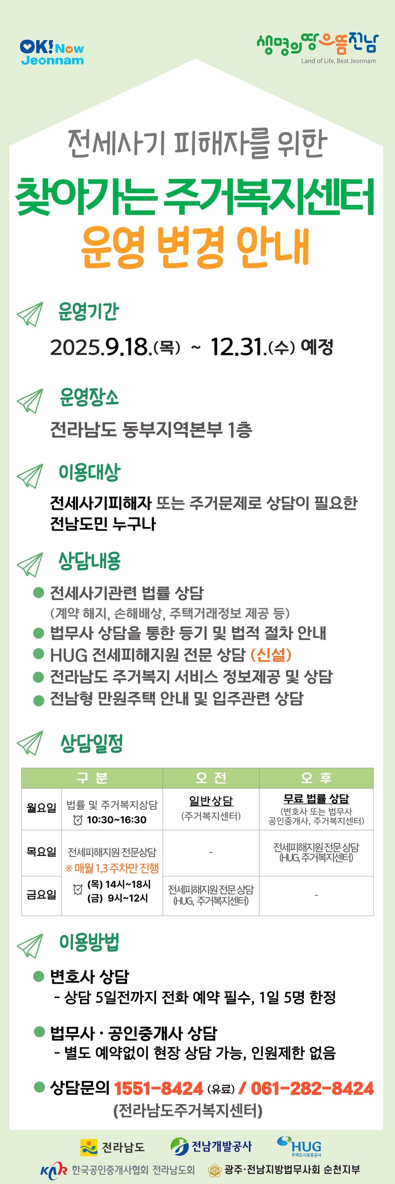 이에 전남도는 전세사기 피해자 접근성을 높이고 주거문제로 상담이 필요한 도민을 지원하기 위해 지난 4월부터 동부지역본부에 찾아가는 ‘주거복지센터-전세사기 피해상담’을 운영중이다.