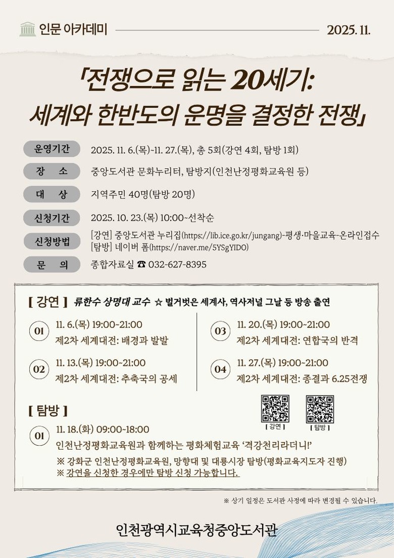 참가 신청은 10월 23일(목) 오전 10시부터 중앙도서관 누리집(https://lib.ice.go.kr/jungang)에서 가능하며, 자세한 사항은 종합자료실(☎032-627-8395)로 문의하면 된다.