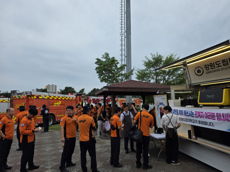 [강원도 세계타임즈=김민석 기자] 강원도립대학교(총장 최종균)는 9월 9일 아침 강북공설운동장 비상급수 운반차량 차고지에서 강릉시 장기 가뭄 극복을 위해 현장에서 헌신하고 있는 급수지원 소방대원들에게 커피와 음료, 빵을 무료로 제공하였다.