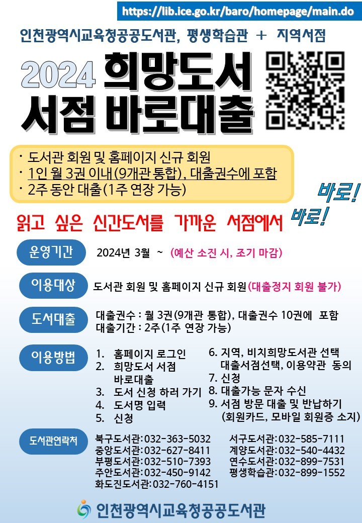사업에는 ▶계양구 6개 서점(계양도서관) ▶남동구 8개 서점(중앙도서관) ▶동구 및 중구 6개 서점(화도진도서관) ▶미추홀구 4개 서점(주안도서관) ▶부평구 8개 서점(북구·부평도서관) ▶서구 및 강화 9개 서점(서구도서관) ▶연수구 5개 서점(연수도서관·평생학습관) 등 총 46개 서점이 참여하고 있다. 시민들은 가입된 도서관과 관계없이 가까운 서점에서 편하게 책을 신청하면 된다. 사업은 예산 소진 시 조기 종료될 수 있고, 관련 자세한 사항은 인천시교육청통합공공도서관 누리집(https://lib.ice.go.kr) 공지 사항에서 확인할 수 있다.