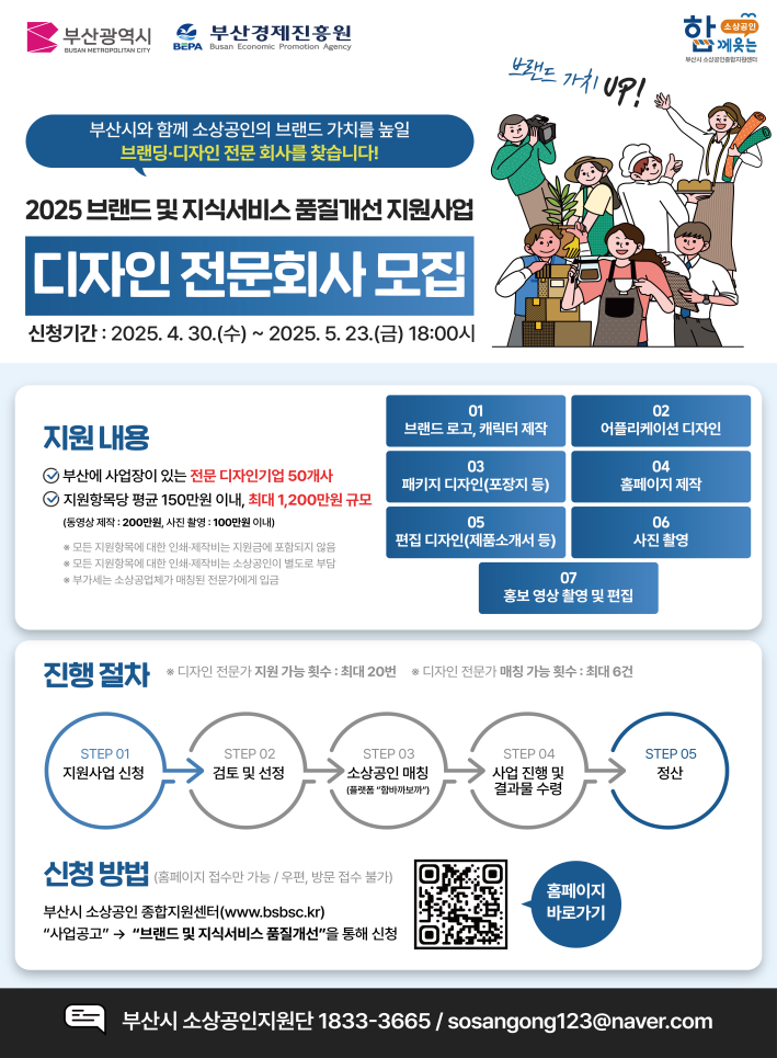 ◈ 오늘(30일)부터 「2025년 소상공인 브랜드 및 지식서비스 품질개선 지원사업」 지원업체 및 디자인 전문가 모집 [부산 세계타임즈=이용우 기자] 부산시(시장 박형준)와 (재)부산경제진흥원(원장 송복철)은 지역 소상공인을 대상으로 「2025년 소상공인 브랜드 및 지식서비스 품질개선 지원사업」을 통한 브랜드 품질과 경쟁력 높이기에 나선다고 밝혔다.