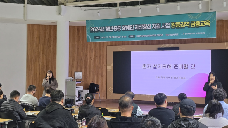 [강원도 세계타임즈=김민석 기자] 강원특별자치도사회서비스원(원장 이은영, 이하 도사회서비스원)은 도내 청년 중증장애인의 자립 역량 강화를 위한 권역별 금융교육을 11월 26일 강릉권역을 시작으로, 11월 27일 원주권역, 11월 29일 춘천권역에서 진행하고 있다고 밝혔다.