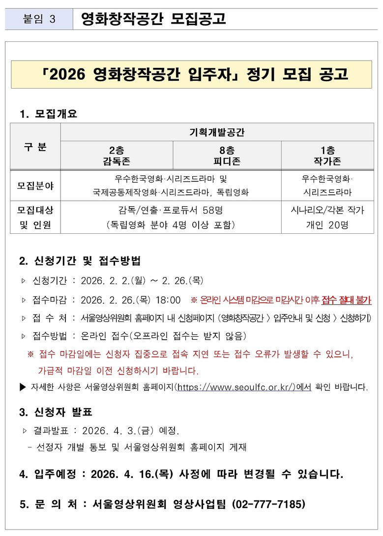 - 2.2.~2.26. 서울영상위원회 누리집 통해 입주 창작자 접수…보증금·임대료 전액 지원