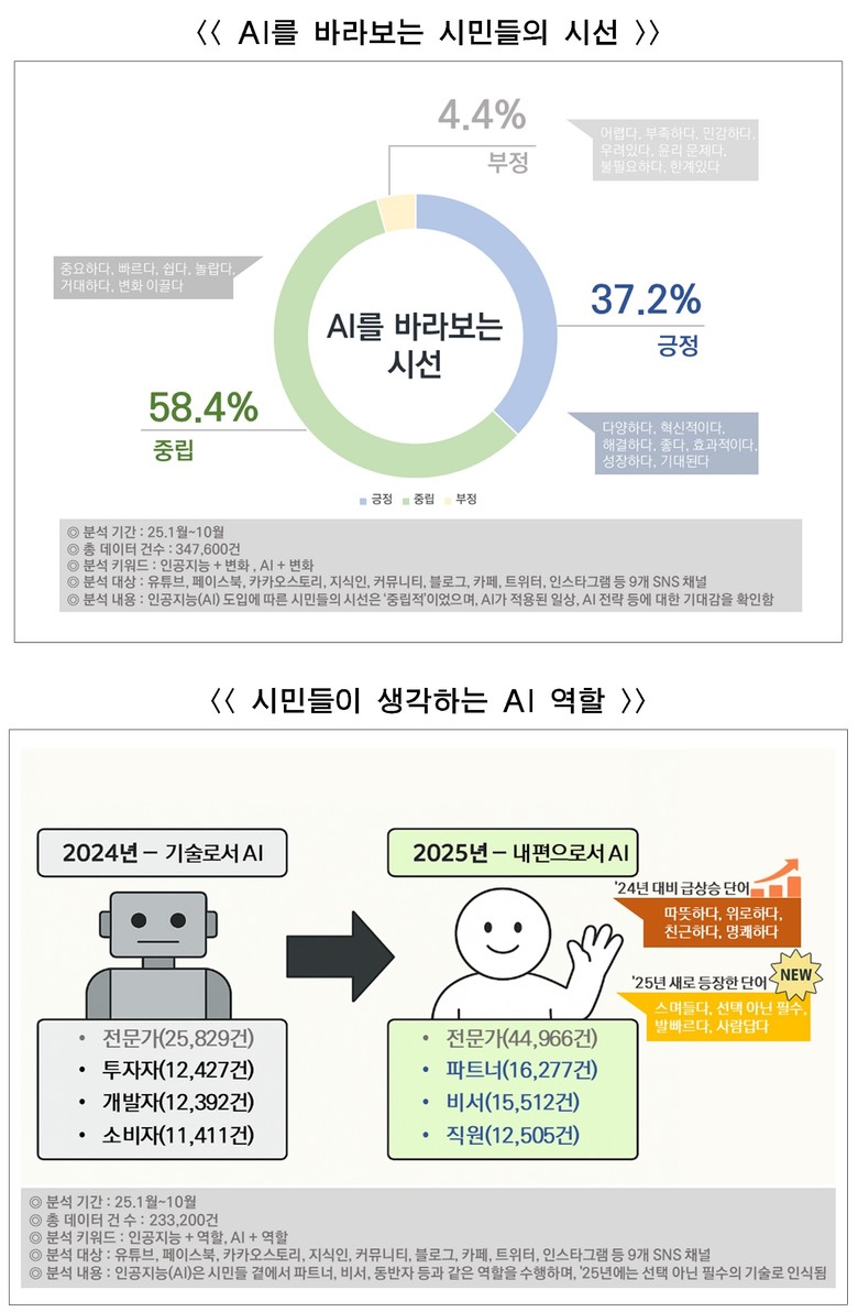 시민들이 AI를 설명하는 어휘도 달라졌다. ▴파트너 ▴조력자 ▴비서 ▴친구 등 관계 기반 표현이 증가했고, ▴따뜻하다 ▴위로하다 ▴친근하다 등 감정적 표현도 늘었다.