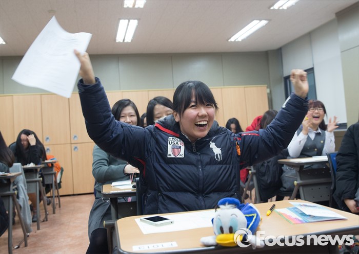 (서울=포커스뉴스) 2015학년도 대학수학능력시험 성적표 배부일인 2일 오전 서울 중구 이화여자외국어고등학교에서 한 학생이 성적표를 받고 만세를 부르고 있다.